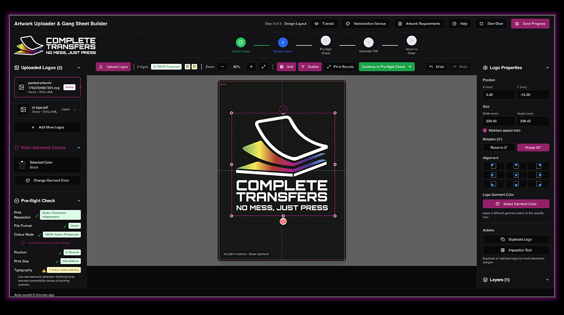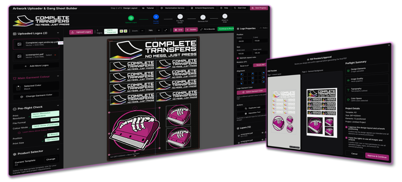 Say goodbye to complicated artwork preparation. Our intuitive Logo Upload and ganging Tool makes it effortless to upload, position, and perfect your logos for screen-printed transfers, DTF, sublimation & badges. Simply upload your artwork onto professional transfer templates, choose from a wide range of garment colours, select your ink options, and instantly preview your design exactly as it will appear in production. Whether you’re ordering full-colour transfers, single-colour prints, or metallic finishes, our system generates production-ready PDFs with precise CMYK colour preservation—no design experience required. Order multiple garment colours with individual quantities in a single click, and enjoy seamless checkout integration. Professional results, simplified workflow, exceptional quality.