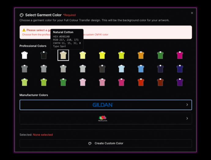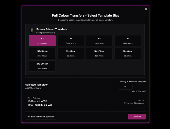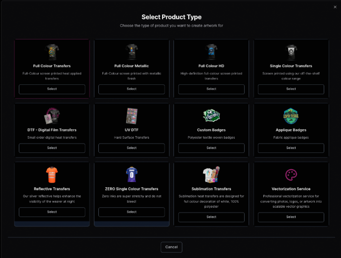 Select from our range of transfer sizes and types - Full Colour, HD, Metallic, and more.